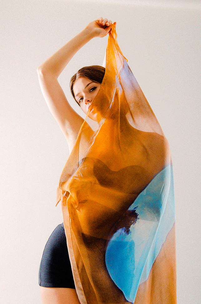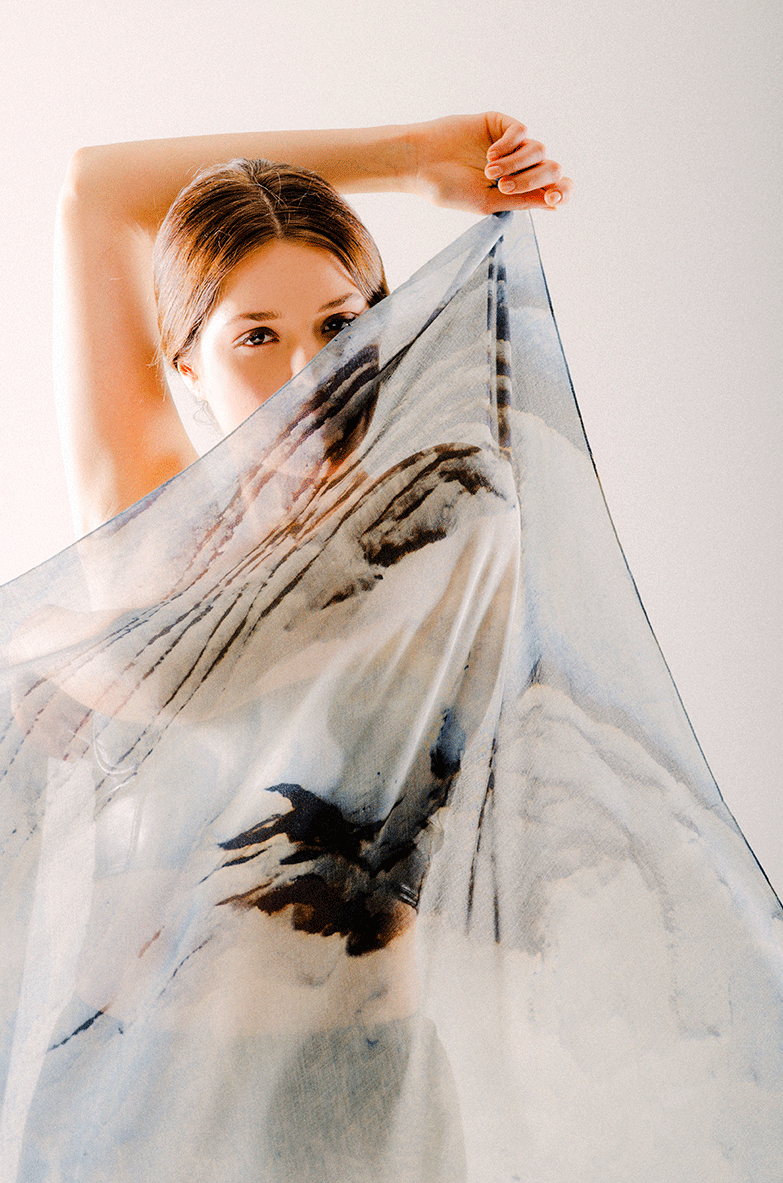 大人になったいま、彼女はニューヨークに落ち着いている。ネオンが輝く夜景の光の中、彼女はサステナブルなブランド「Slow Factory」を設立。あの幼い頃眺めた星空の神秘を、美しいスカーフに仕立てた。