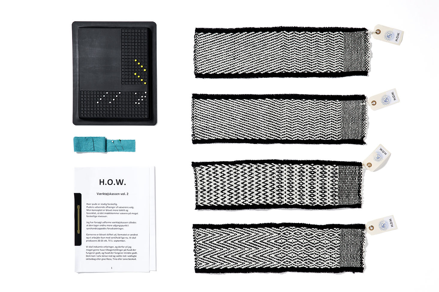 In close dialogue with the weavers, I developed a tactile toolbox. Using the toolbox, the weaver could make three technical weaving choices with the sense of touch — a ground structure, a decoration element, and a color/material combination. The weaver would then combine the choices in the weaving process. Thus, the weavers became co-designers of the textiles they produce.